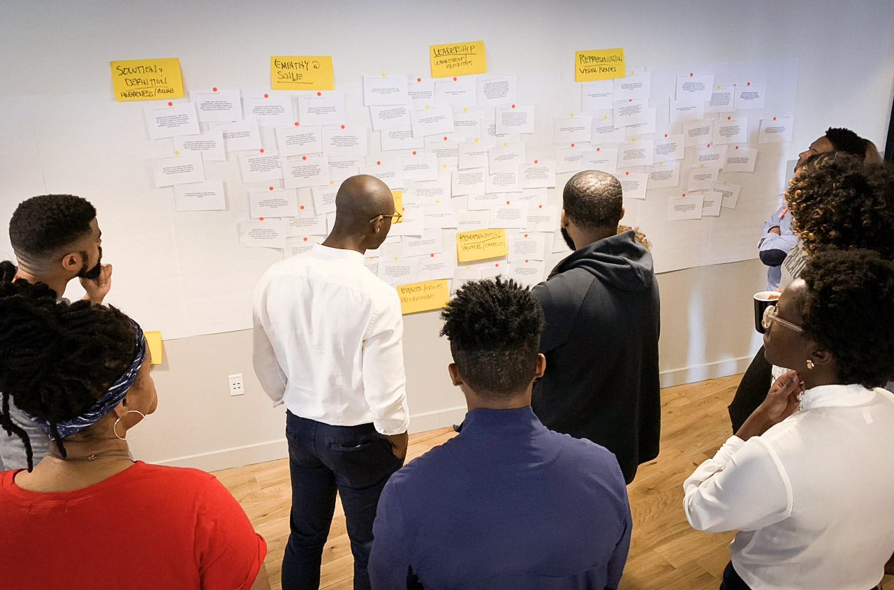 Participants used cards with the survey responses to form clusters based on their affinity to one another. From one card on the wall to nearly one hundred, themes began to emerge that were then adapted to "how might we..." questions. We then used the points that materialized in an ideation exercise where participants cross-referenced the "how might we..." items against the categories of environment (space), behaviors, culture, and purpose. The results were a high-volume set of wide-ranging ideas. The ideas that showed the most promise for lasting impact were carried forward to a prioritization exercise, rounding out the envisioning session.